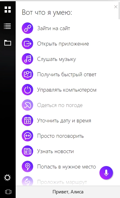 Если на главной (первой) вкладке нажать слева на иконку "вопросительный знак", то Вы там увидите небольшой список того, что умеет Алиса:
