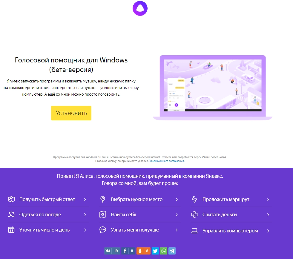 Для установки "Алисы" на ПК, необходимо перейти на сайт https://alice.yandex.ru/windows и нажать на "Установить", после этого у Вас скачается установочный файл. Запускаем и устанавливаем.