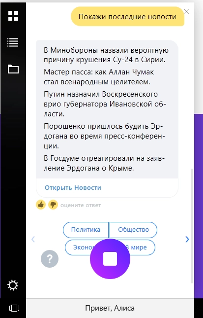 Для теста я решил спросить у нее последние новости, на что Алиса сказала, что передает слово своему коллеге из "Яндекс.Новости", и мужской голос начал читать новости.